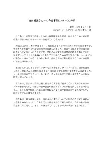私たちは、国会前で安保法制に反対する声を上げ続けてくれた奥田さんやシールズの若者たちが、不法な脅迫や誹謗中傷にあっている事態を決して容認できません。こうした事態は、民主主義の根幹である言論の自由に対する挑戦であり、絶対に許すことはできません。
